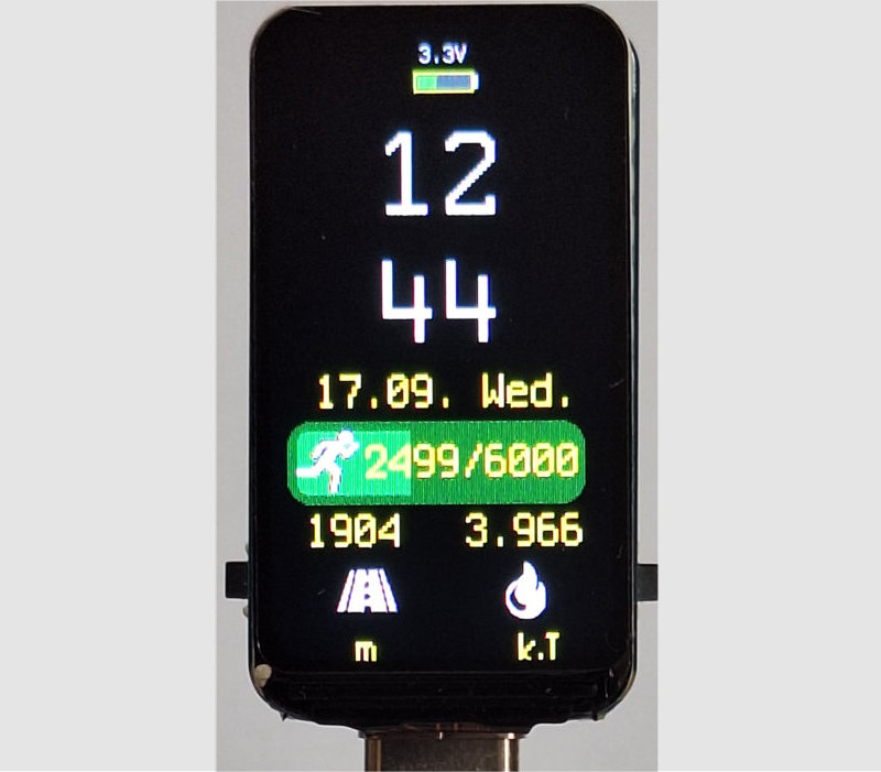 Laden Sie sich die Anwendung für eine einfache Fitnessuhr mit dem RP 2350 herunter. Sie zählt mit Hilfe des Bewegungssensors Schritte und gibt
