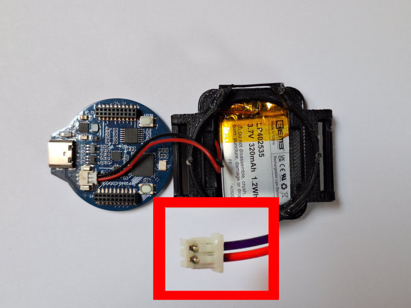 So, jetzt wird das Display angeschlossen; das Kabel vorsichtig im Gehäuse verstaut und das Display auf das Mittelteil aufgelegt. Drücken Sie dabei nicht mit dem Daumen auf die Mitte des Displays, es könnte es Ihnen übel nehmen. Abgeschlossen wird das Gehäuse jetzt noch mit dem oberen Ring. Den verklebe ich mit ganz wenig Kunststoffkleber an den Stiften. Unterteil und Mittelteil, welche ja nicht geklebt sind, werden später sicher durch das Armband zusammen gehalten. Das hat den Vorteil, dass man bei Bedarf auch mal an die Platinenrückseite kommt, um die 'Bootsel-Taste' zu betätigen. Z.B. bei einer Neuinstallation.