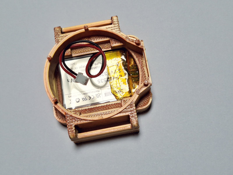 ist das durchbrochene Zifferblatt mit der sich bewegenden Unruhe. Das Display wird wieder in einem vom 3D-Drucker hergestellten Gehäuse mit
