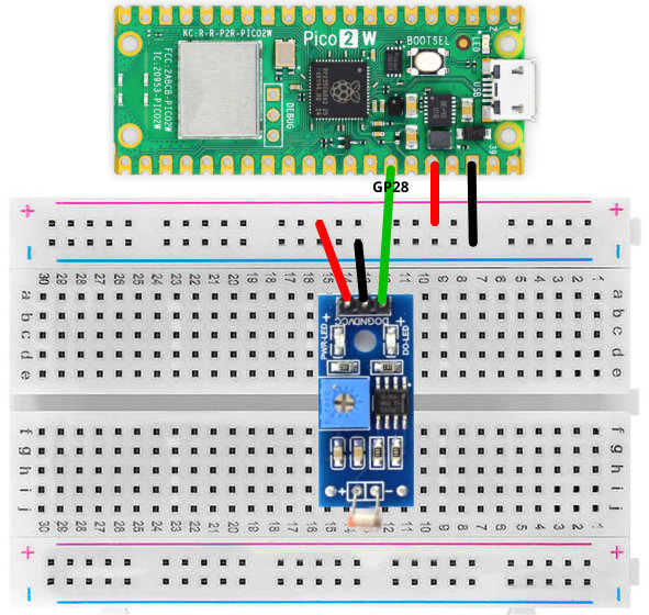 werden. Die Abbildung zeigt den Anschluss des Lichtsensors an den Pico 2 W: